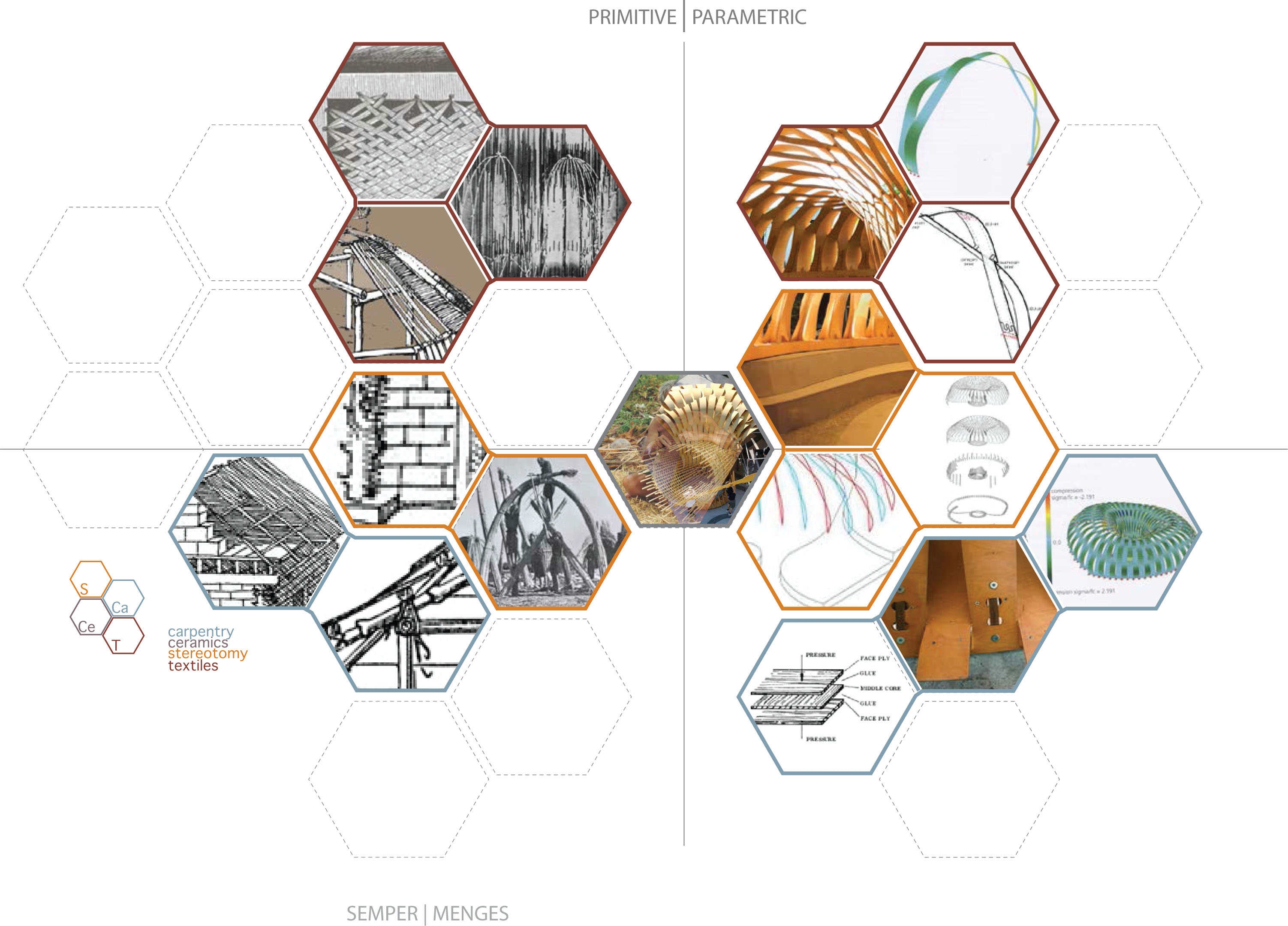 In order to revise the structural logic of Semper’s biological assumptions, we chose contemporary architects who specifically referenced Semper’s theory of tectonics and used the contemporary findings of genomics to create their architectural forms. These architects included Lars Spuybroek, whose ‘textile tectonics’ is a purposeful inversion of Semper’s tectonic system, and the research group led by Achim Menges in London, whose writings make direct reference to Semper and contemporary biology. We tended toward selecting contemporary pavilion and demonstration projects that emulated the scale of the primitive huts Semper used to model his original theory of the four elements. Whenever possible, we chose forms with similar tectonic structural systems to permit the juxtaposition and overlay of historical century case studies to reveal both explicit and implicit conceptual relationships between the critical functions of biological metaphors in architectural discourse.