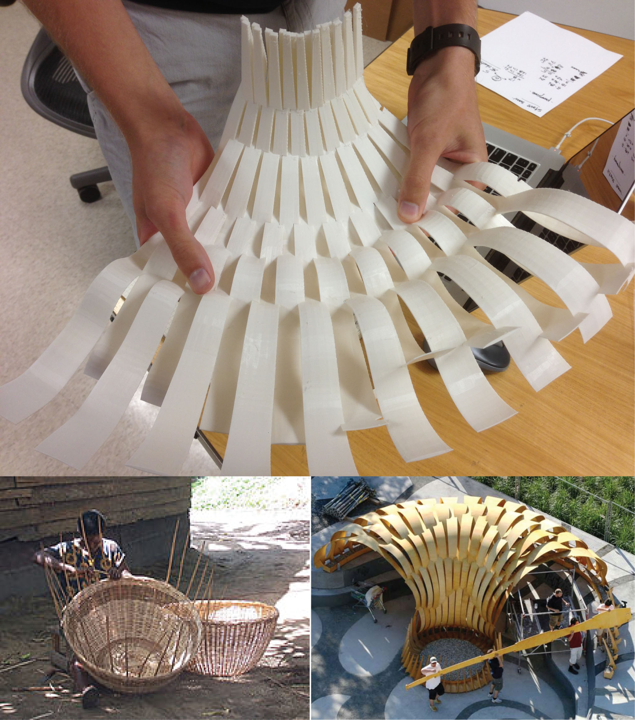 The abstract character of each 3-D model allows the viewer to relate the formal and cultural referents included in each collage, which conflates the ‘primitive’ and ‘parametric’ qualities of each historical case study into one synthetic image. For example, one of the collages that we chose to use in the exhibit combines the formal and cultural attributes of three separate projects: NOX’s Sun-O-House of 2006 and the Tirolean truss system illustrated in Gottfried Semper’s Der Stil (1860-63). [Fig. 3] The sectional character of this model conceptually transforms the fundamental aspects of the Semper’s Tirolean truss system into the complex geometries of NOX’s Sun-O-House. The individual trusses of each case study are juxtaposed with one another, projecting creating the flowing geometries present in NOX’s water pavilion from the typological systems outlined in Der Stil. The new synthetic form that is created proposes a semiotic integration (and implicit revision) of the primitive hut of the past with the parametric pavilions of the present. The same is true for the ICD pavilion designed by Achim Menges in 2010. [Fig. 4] Our juxtapositions of the weaving techniques described in Semper’s thesis and used to construct the physical pavilion in Stuttgart establish a confusion between the ‘primitive’ and ‘parametric’ referents in the show. The fact that the final product can be held in one’s hands, returning the full-scale abstraction of Menges’ original construction back to the primitive contexts of Semper’s architectural treatise only reinforces this confusion. Yet, the result is not negative insofar as it makes the viewer of the show consciously realize the structural and technical relationships that exist between two competing models of biology in architecture.
