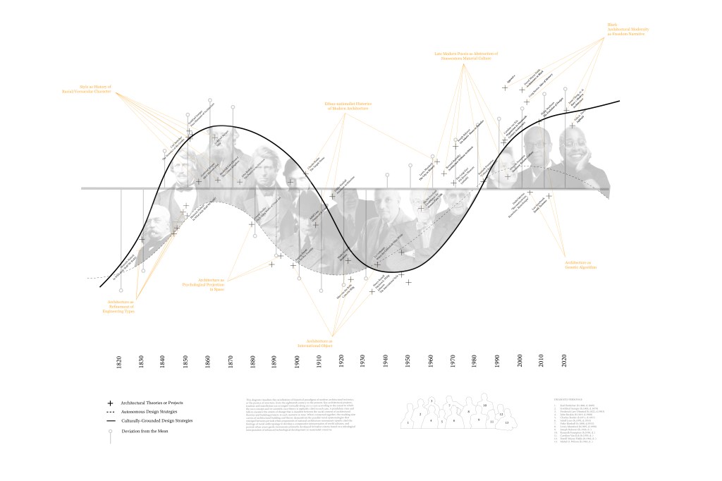 Second, the two diagrams I made are temporal traces of the background influence of race thinking on architecture theory. In the first diagram, I note the alternation within biological metaphors for design between sources that explicitly cite research from fields that attempt to place the role of race and racial identity in biological, social and cultural matters versus those that focus upon the formal or morphogenetic principles of biology to the omission of its role in constructing identity as such. In this manner, my work attempts to trace the general tendencies of architectural discourses toward and away from scientific race theory as a critical basis for making substantive judgements about form, national origins, temperaments, etc.