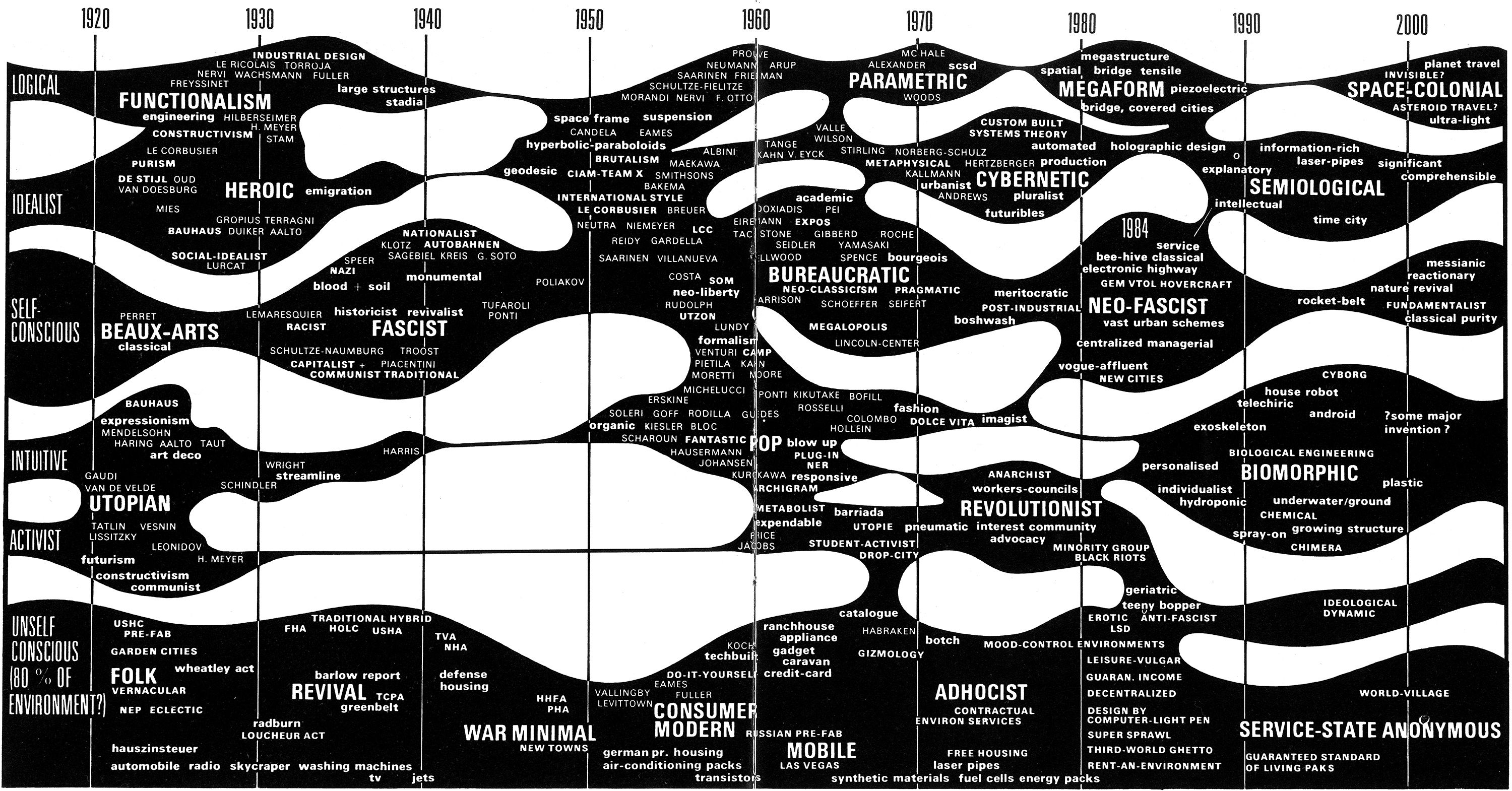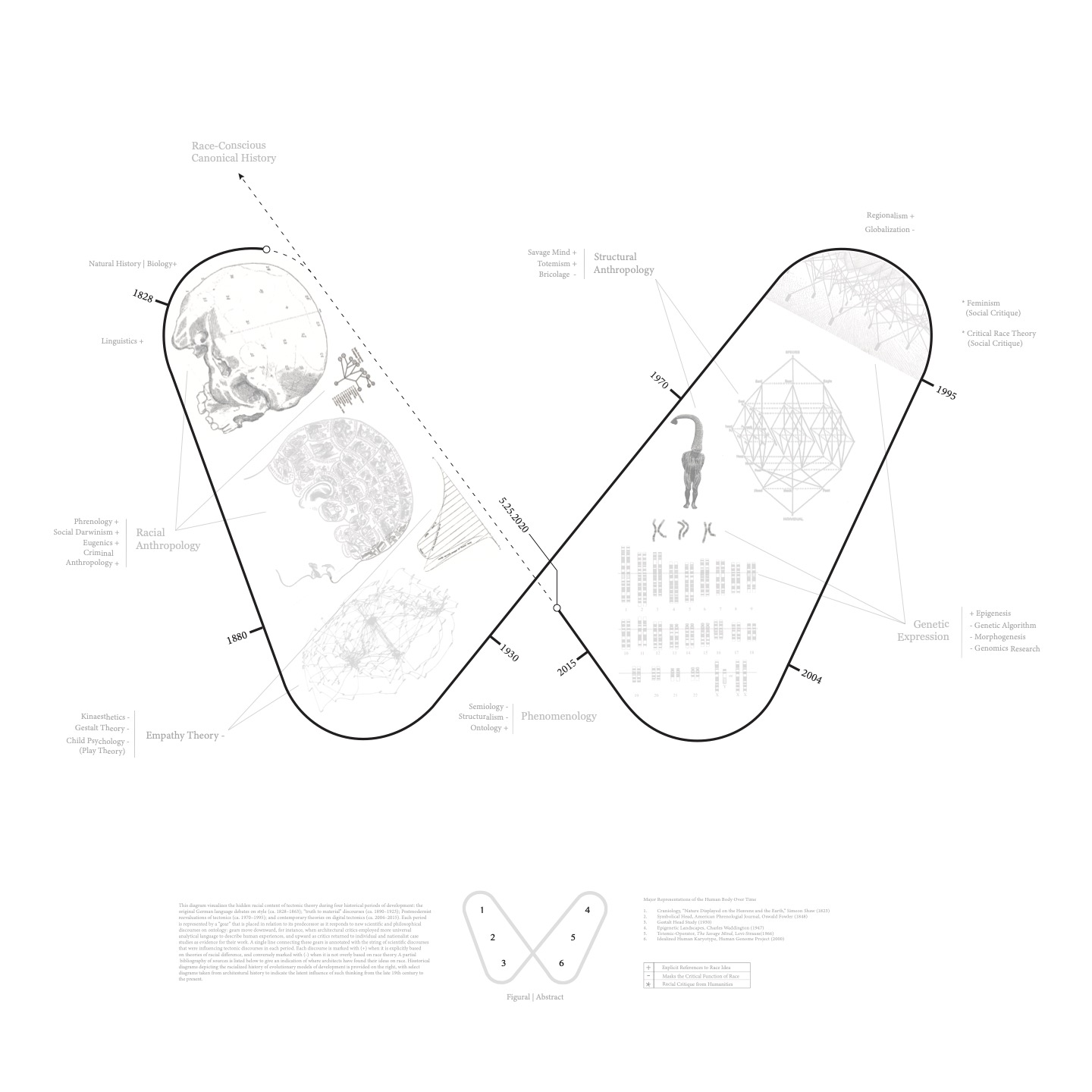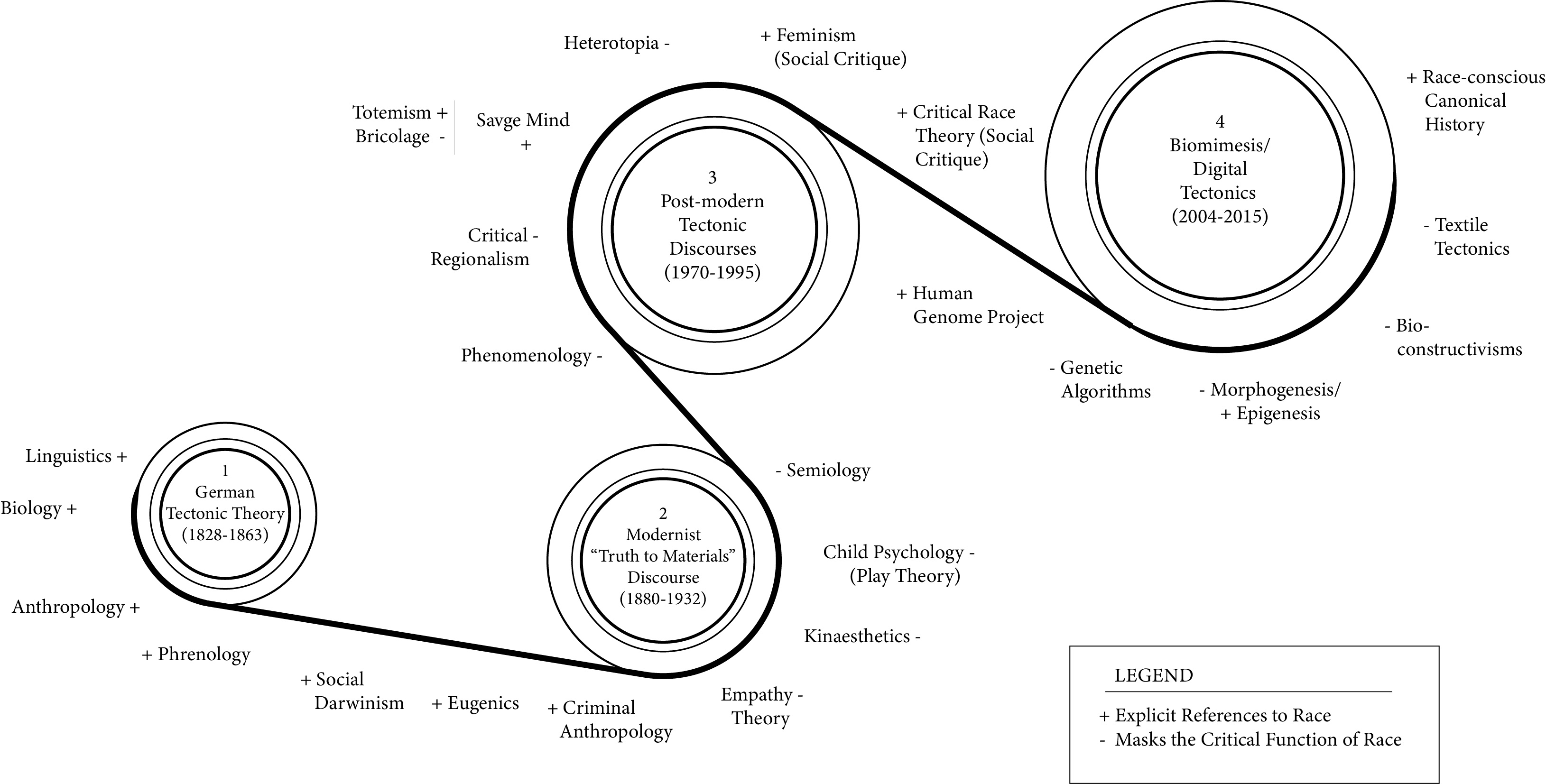 Second, the two diagrams I made are temporal traces of the background influence of race thinking on architecture theory. In the first diagram, I note the alternation within biological metaphors for design between sources that explicitly cite research from fields that attempt to place the role of race and racial identity in biological, social and cultural matters versus those that focus upon the formal or morphogenetic principles of biology to the omission of its role in constructing identity as such. In this manner, my work attempts to trace the general tendencies of architectural discourses toward and away from scientific race theory as a critical basis for making substantive judgements about form, national origins, temperaments, etc.
