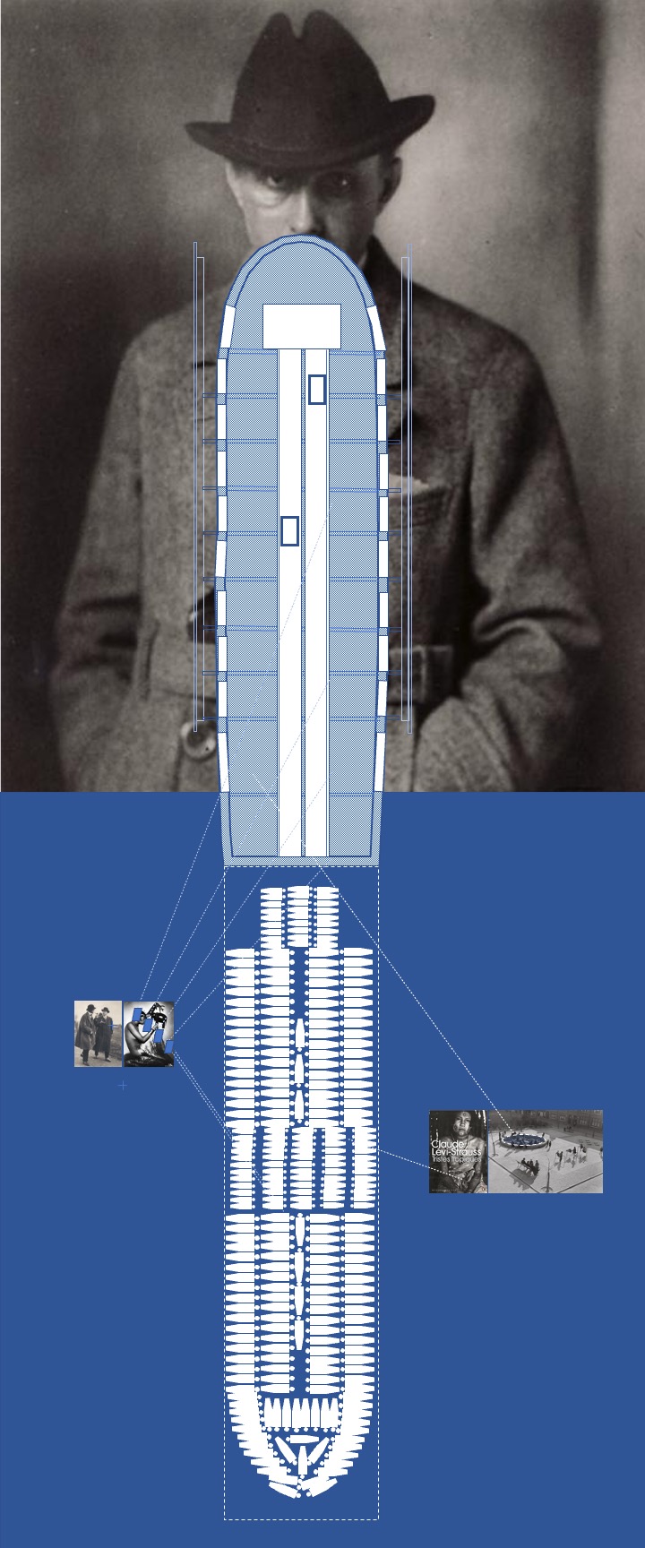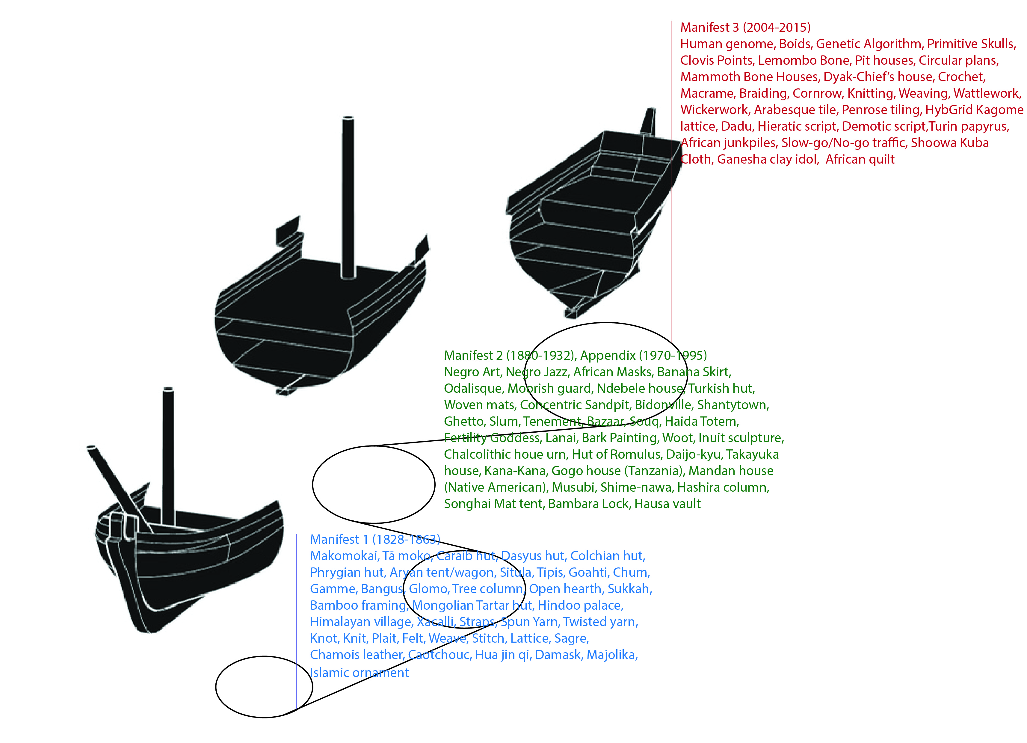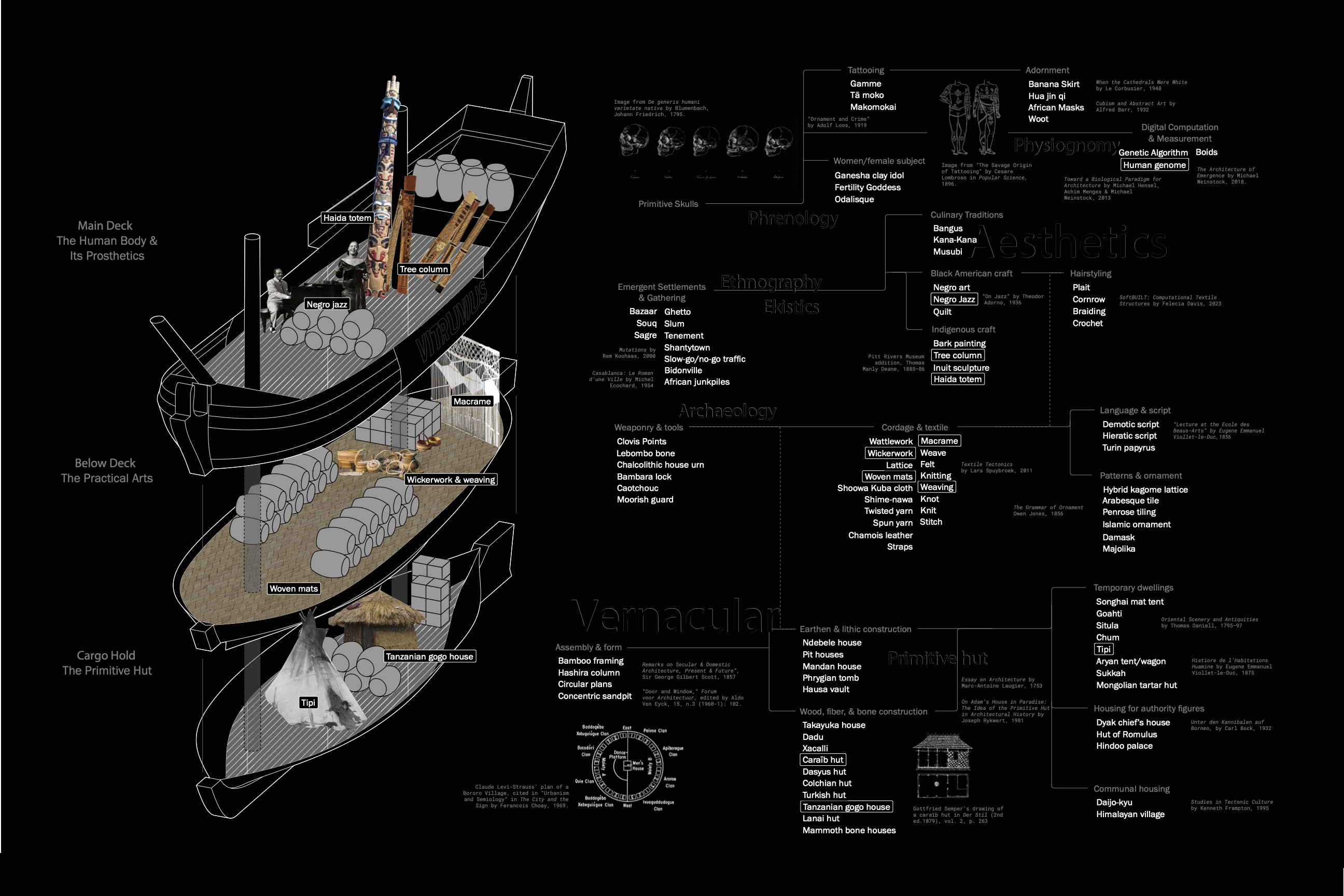 During the process of making these two diagrams, Curry experimented with transforming the visual trope of the slave ship into a diagram that outlines the cultural expropriations of Black material culture in the discipline of architecture. Each of the diagrams we created collectively expose the specific references that can be found in architectural tectonic theories. What is explicit in Curry’s “Middle Passage” diagram is notes in more bibliographical and paradigmatic terms in my earlier studies. As a triptych, they provide a nuanced reading of the temporal flow of architectural references which coexist as metanarrative in contemporary theory and as new innovations at discreet moments in time.