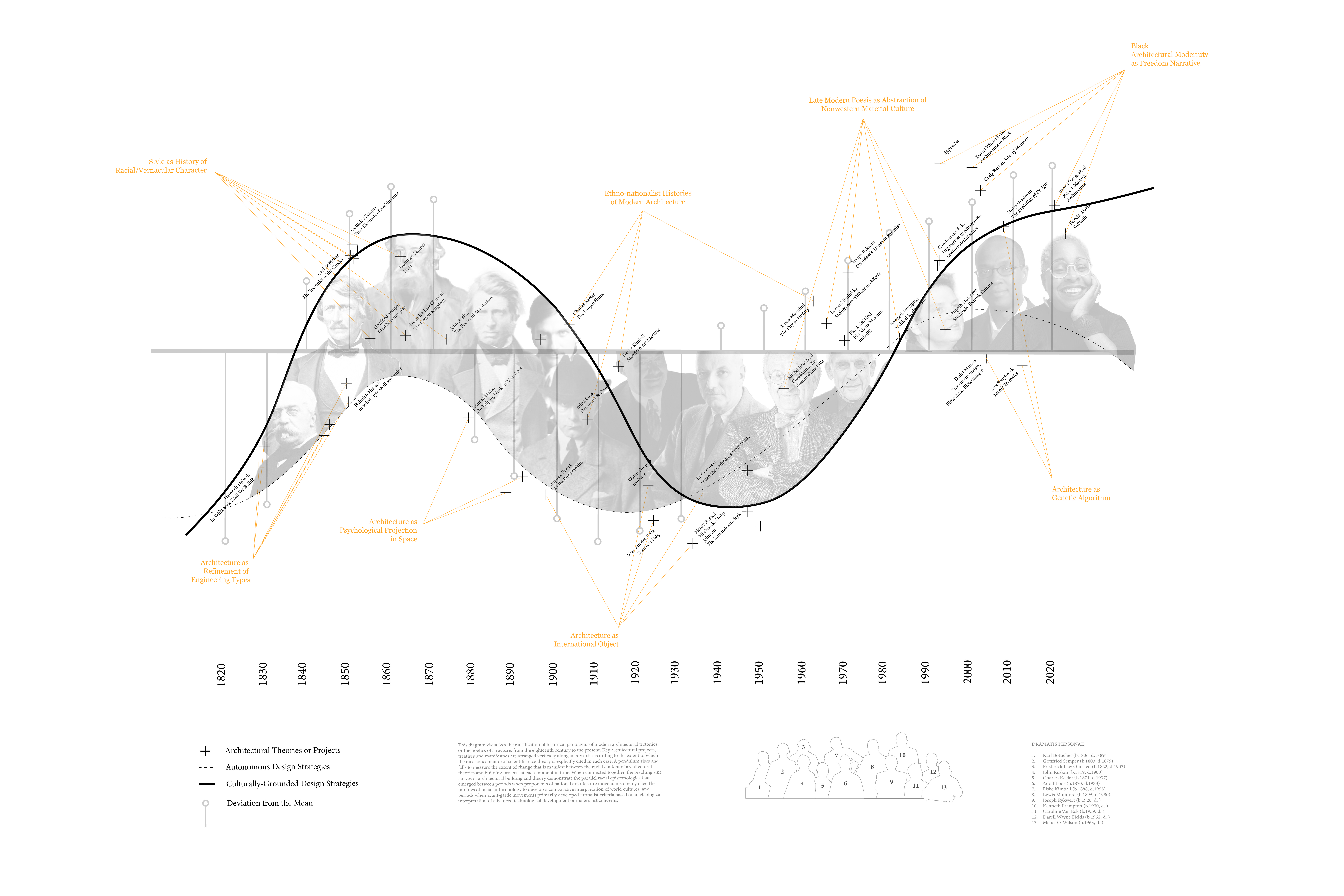 First and foremost, none of my research is interested in identifying whether any individual person is a ‘racist’ or not. I find those conclusions to be reductive and immaterial on their own (even though people will make such assumptions of my work as they did of Jencks’ diagrams). What is of greater importance, to me at least, is whether the specific discourses an architect or designer engages is racial (or racialist in 19th century parlance) in its mode of thinking. In this way, many paradigms and discourses continue to labor under the legacy of 19th century racialist thought, even if they do not explicitly mention race, identity or nationalism. For me, this is the most appropriate attitude with which to approach the two diagrams I constructed for the exhibit.